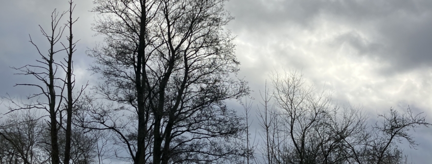 Ich lasse alles so stehen, wie der Herbst es gelassen hat. Die Pflanzen haben fast alle Blätter abgeworfen, das Laub liegt teilweise noch auf dem Boden. In den Beeten stehen die Reste der Stauden. Es sieht ziemlich grau aus.